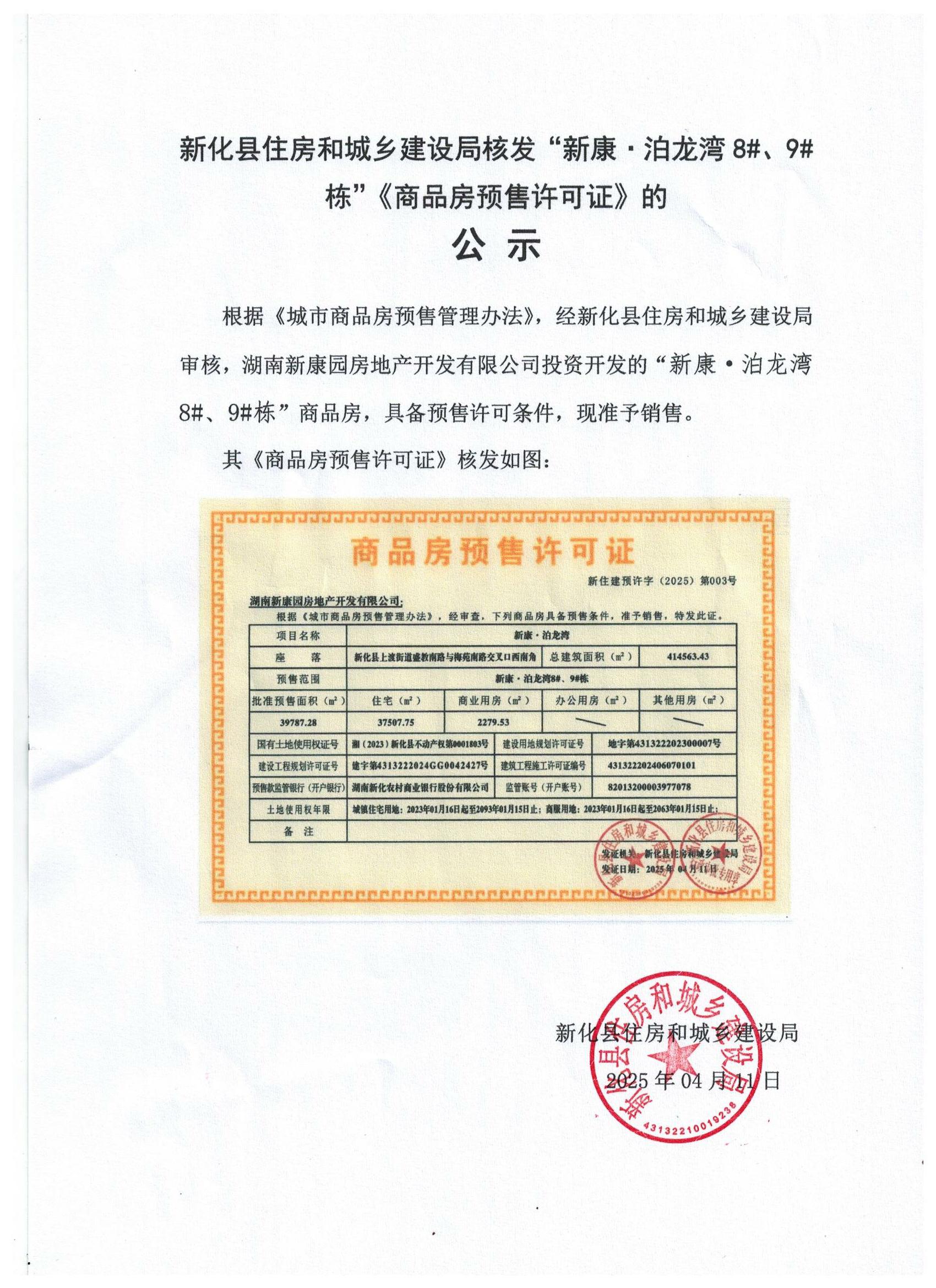新化县住房和城乡建设局核发“新康.泊龙湾8#、9#栋”《商品房预售许可证》的公示